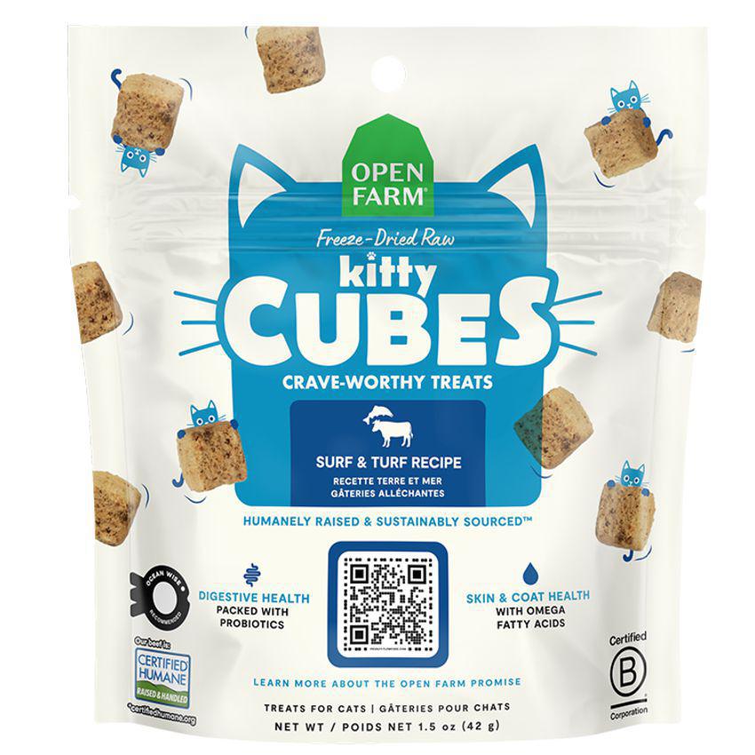 Surf & Turf Kitty Cube Treats. These bite-sized treats for cats are freeze dried raw with Ocean Wise recommended, wild-caught fish and humanely-raised beef to preserve nutrition and crave-worthy flavor. Our first-ever cat treats, Kitty Cubes are enriched with omega fatty acids and probiotics to promote skin & coat health, and a healthy digestive system.