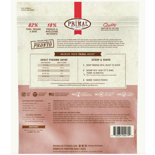 Pork (with ground bone), Pork Liver, Organic Kale, Organic Squash, Organic Parsley, Organic Apples, Organic Carrots, Organic Pumpkin Seeds, Organic Sunflower Seeds, Organic Broccoli, Organic Blueberries, Organic Cranberries, Organic Apple Cider Vinegar, Montmorillonite Clay, Fish Oil, Organic Coconut Oil, Dried Yeast, Cod Liver Oil, Vitamin E Supplement, Organic Ground Alfalfa, Dried Organic Kelp, Liquid Lactobacillus acidophilus fermentation product, Liquid Lactobacillus casei fermentation product, Liquid Lactobacillus reuteri fermentation product, Liquid Bifidobacterium animalis fermentation product, Taurine