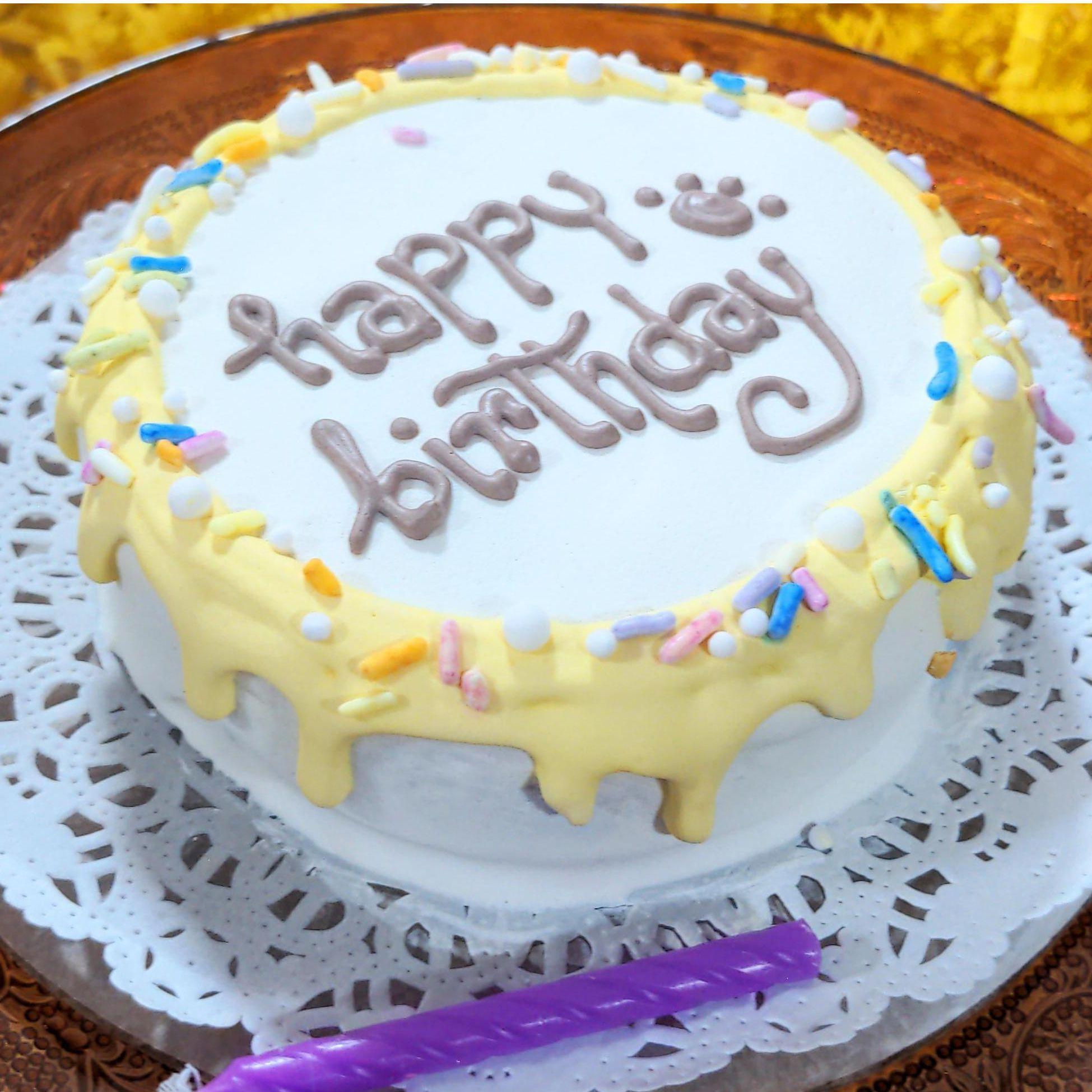 Made with Oat flour, Chickpea Flour, Peanuts, Bananas, eggs, Vegetable oil, Vegetable color powder, all natural sprinkles, hard yogurt frosting.