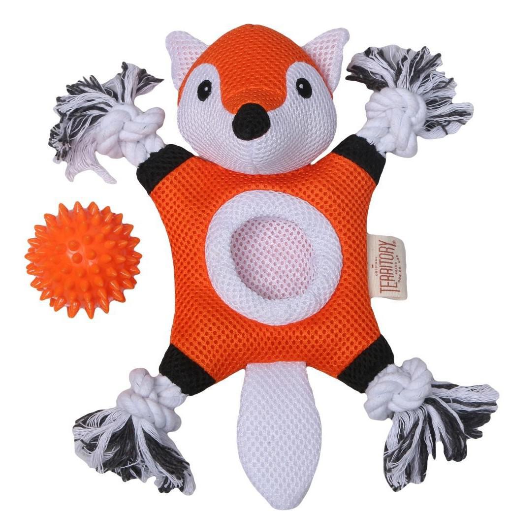 Mark Your TerritoryTM in the great outdoors with Territory's Fox 2-in-1 Dog Toy! Designed with durable fabric and a flexible rope structure, this toy is paw-fect for all types of interactive play. Plus, we included a squeaker ball that pops out of your farm friend for an extra level of fun. Whether it be tug, fetch, or something else fun, your pup will feel like a sly fox at play with this toy!